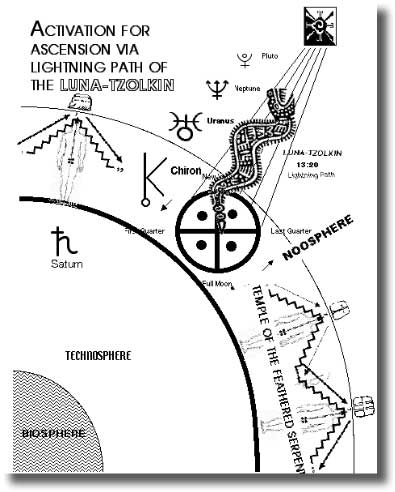 Simply put, the 21 years it takes to pass through one Luna-Tzolkin round represents one Uranian "season" --- one quarter of the time it takes for Uranus to orbit the Sun. Or, in other words, four Luna-Tzolkin rounds = one Uranian year.In the broadest view, The Lightning Path bridges two distinct domains of consciousness. These domains are symbolized, on the one hand, by all the planets from the Sun out to Saturn, and on the other, by planets Uranus, Neptune and Pluto. In Time and The Technosphere, Arguelles refers to these two domains as the "technosphere" and the "noosphere", thus evoking the work of visionary Jesuit priest, Teilhard de Chardin, who coined the phrase "noosphere" many years ago.