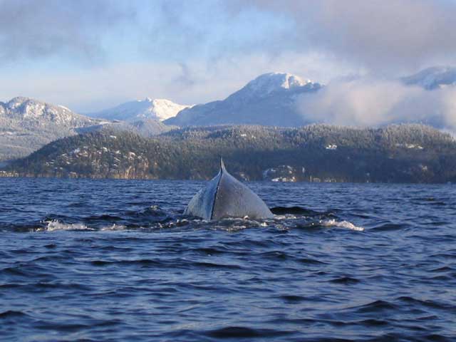 Photo copyright Dwayne Edward Rourke 2004 Ann Mortifee and I went out in our kayaks for sunrise on New Year's Day 2004 and encountered a humpback whale. We first encountered it from a few hundreds yards away. It was breathing intensely and regularly whilst staying perfectly stationary in the water. It was its HUGE BREATH that alerted us to its presence. Otherwise we might have mistaken it for a floating log as most of its body was submerged.
