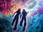 Our final preparations involve reviewing whatever written materials we have regarding the hieroglyph and number specific to the date of our New Moon ritual as seen within the context of The Lightning Path. Some of this information is noted in a small journal set aside for these ceremonies only. We may draw a divination card or two from various decks and make note of this information as well. We then approach a prepared blank canvas with brushes and paint at the ready. We take turns at first but invariably we find ourselves working simultaneously as the details of the image reveal themselves. We try to come to the process with total receptivity and openness, with no preconceived ideas of outcome. We keep in mind the Lightning Path hieroglyphic information for the current Moon cycle, through its keywords and symbols. Sometimes they show up directly in the imagery, but not always. We are constantly amazed and excited with the results which manifest over the course of the ritual which is often not complete for two or three days. We very much consider what we are doing here to be a labor of Love and we intend to regularly share some of the results of our process on this website. In keeping with the nature of conscious lunar cycle attunement, we intend to post our documentation as soon as possible after each New Moon. We hope our documentation will inspire you in your own creativity.